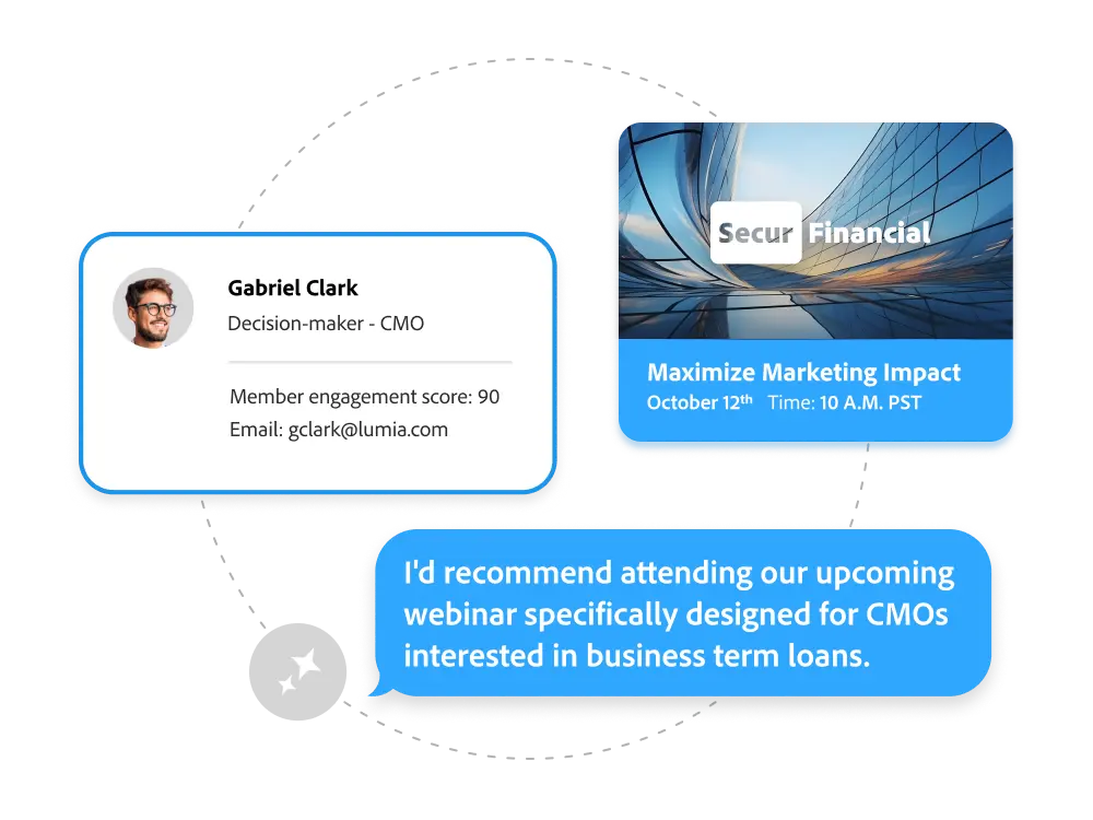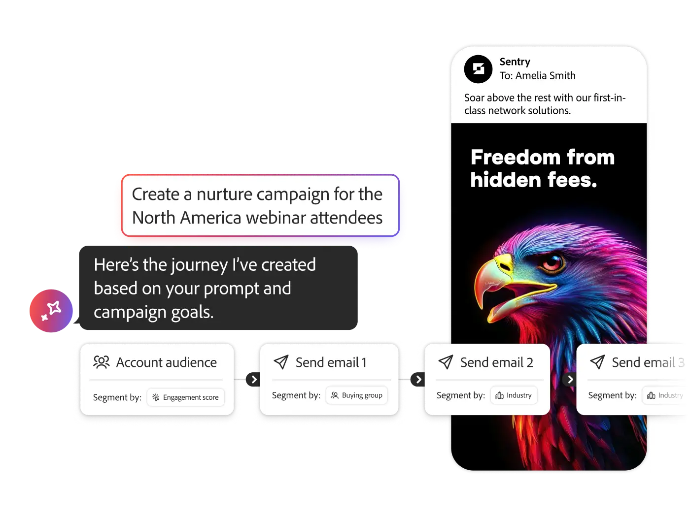 - 여정 생성. 마케팅 개요, 텍스트, 이미지, 음성 프롬프트와 같은 입력을 사용한 데이터 기반 추천을 통해 다단계 여정을 생성하세요. 실행 속도를 크게 높일 수 있습니다.
