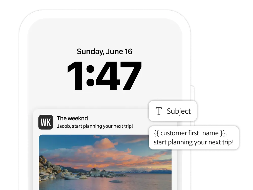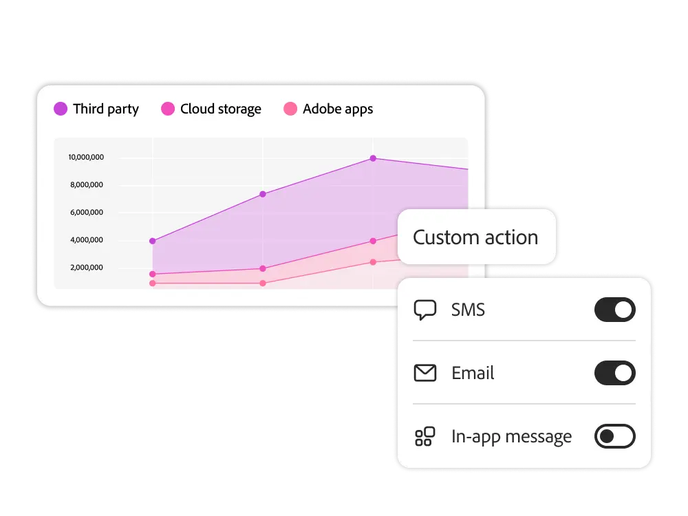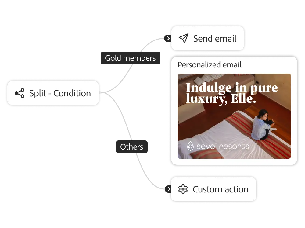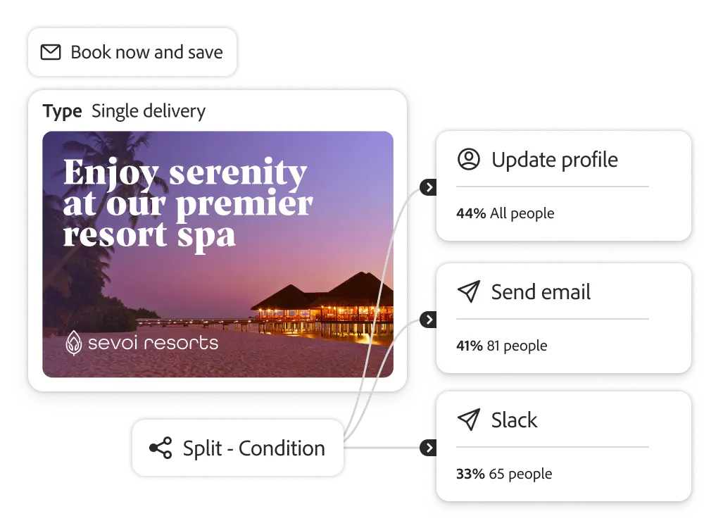 드래그 앤 드롭 방식의 직관적인 캔버스에서 여러 단계의 고객 여정을 구축하세요. 행동, 상황 데이터, 비즈니스 이벤트를 바탕으로 채널 전반에서 메시지, 제안, 콘텐츠를 통합 관리하고 활성화하여 고객을 타겟팅할 수 있습니다.