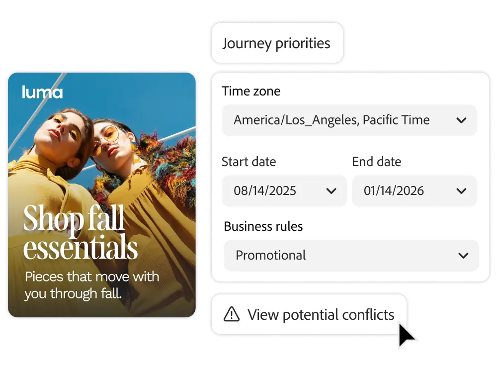 • 충돌 감지. 중복되는 커뮤니케이션을 식별하고 타임라인, 고객 중복, 채널 구성을 모니터링하여 마케팅 활동이 중복되지 않게 할 수 있습니다.