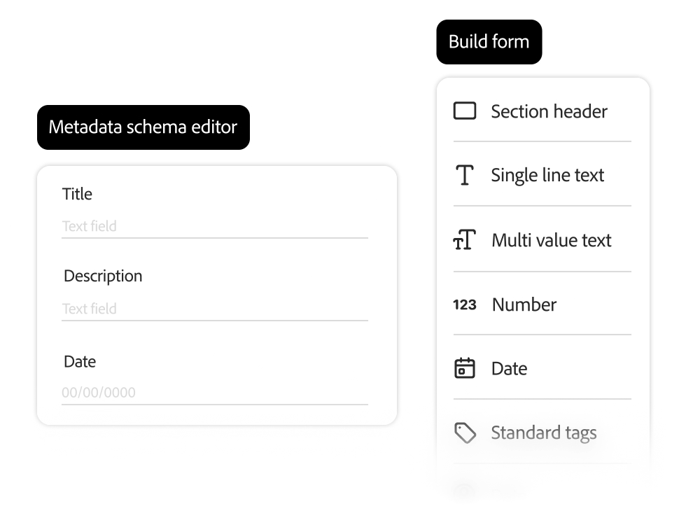 • 맞춤 메타데이터 스키마. 비즈니스의 특정 요구 사항에 맞게 메타데이터와 태그 지정을 맞춤화할 수 있습니다. 관리자는 각 에셋에 필요한 메타데이터 속성을 지정하여 저장소에서 에셋을 검색하고 정리하는 방식을 개선할 수 있습니다.