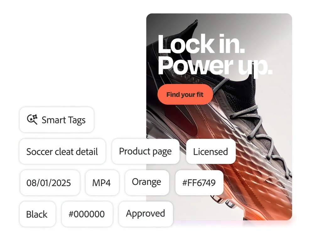 • 브랜드에 맞는 태그 지정. 제품 및 브랜드와 연관성 높은 컨텍스트 기반의 GenAI 메타데이터 태그 지정 기능을 사용하면 에셋을 쉽게 검색하고, 재사용률을 높이고, 메타데이터를 보강할 수 있습니다. DAM의 모든 에셋에 태그를 수동으로 지정하지 않아도 됩니다. 제품 정보, 브랜드 이름, 제목 설명, UPC 코드, SKU 등 에셋의 시각적 텍스트를 검색 가능한 메타데이터 태그로 변환할 수 있습니다. 또한 자동 번역을 통해 여러 지역에서 다양한 언어로 태그를 검색하도록 할 수 있습니다.