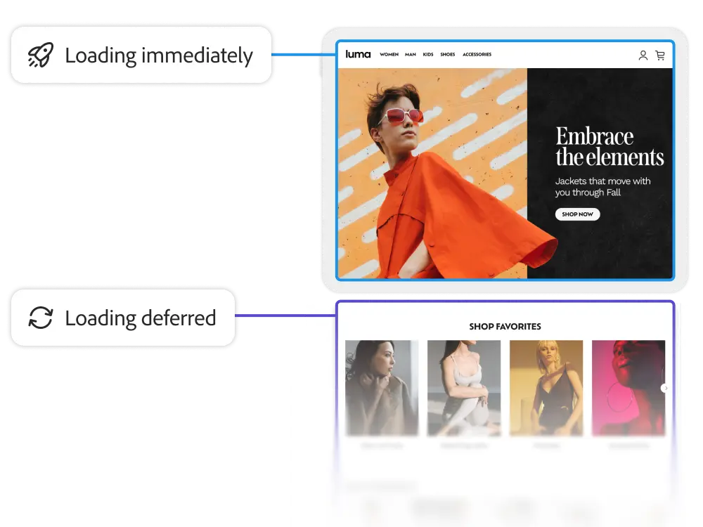 Edge Delivery Services는 성능 중심의 아키텍처를 제공합니다. 지능형 렌더링으로 HTML, CSS, JavaScript 코드를 인터랙티브한 섹션과 시각적 섹션으로 변환할 수 있고, 단계적 렌더링 알고리즘으로 각 페이지에서 가장 눈에 잘 띄는 부분을 먼저 로딩해 페이지 로딩 속도를 높이고, 이탈률은 낮춰 SEO 순위를 높일 수 있습니다.