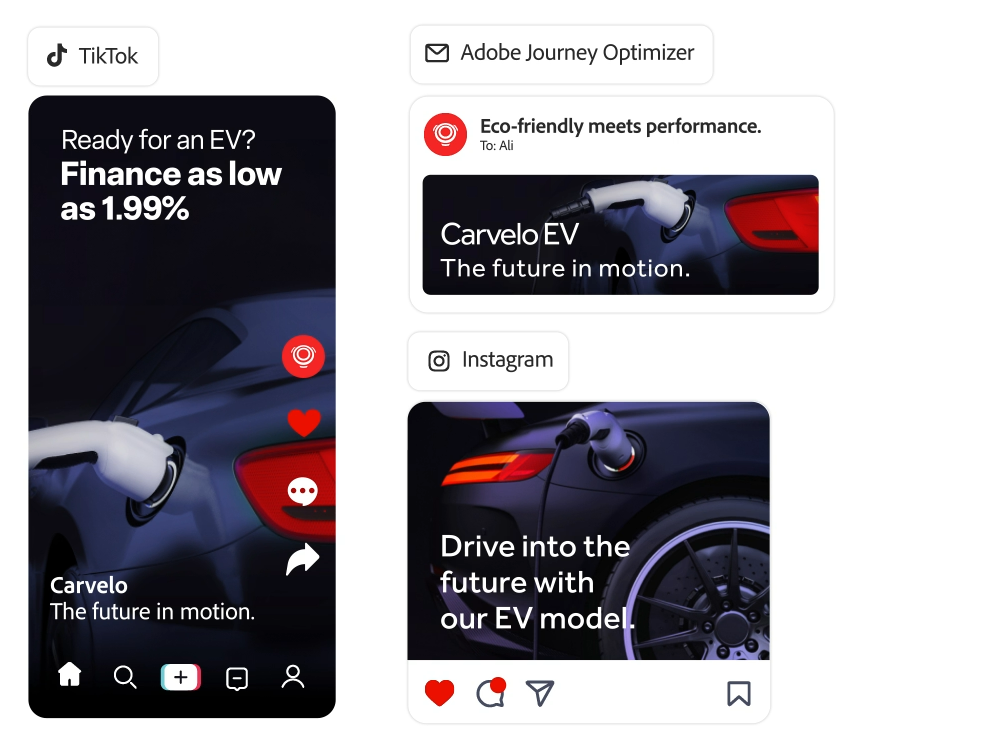 • 오디언스별 광고 게재. Adobe Real-Time CDP와 통합하면 Meta, Google, LinkedIn과 같은 플랫폼에 맞춤형 광고를 게재할 수 있으며, 오디언스는 해당 플랫폼에서 동적으로 최신 정보를 확인할 수 있습니다. 즉, 캠페인이 시작되면 적합한 메시지가 적절한 오디언스에게 전달됩니다.