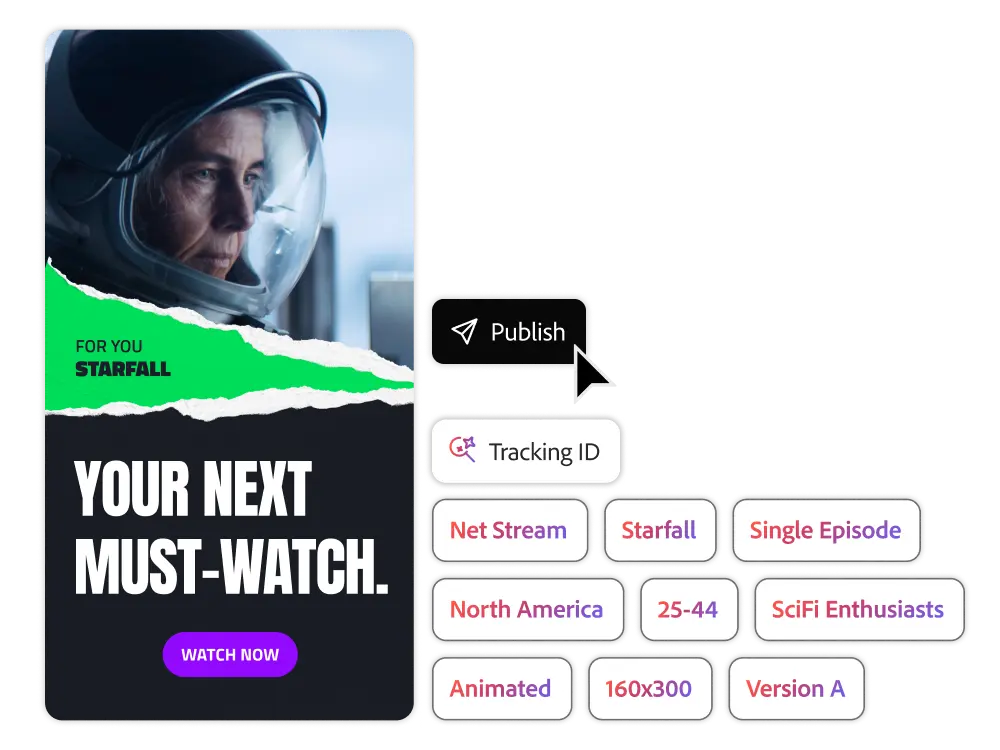 • 연결된 광고 게재. Meta, LinkedIn, TikTok, Amazon, Innovid(이전 Flashtalking), CM360, 기타 서드파티 퍼블리셔에게 완벽히 구성된 광고를 전달합니다.