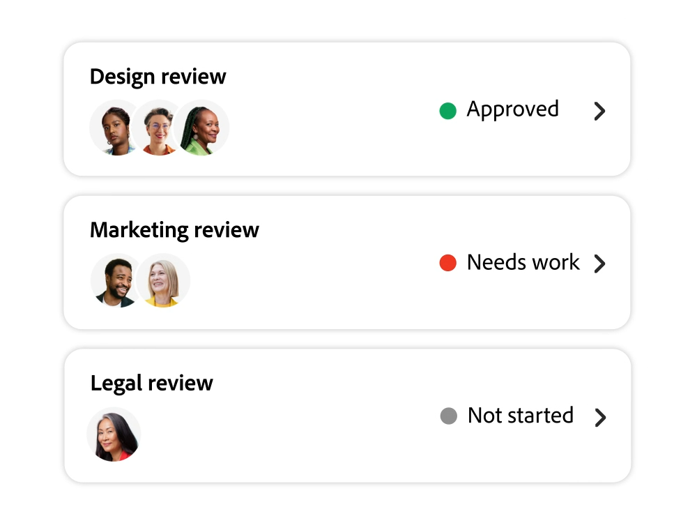 • 협업 워크플로우. 내장된 승인 워크플로우를 통해 마케터는 크리에이티브, 법률, 마케팅 운영 등 여러 팀과 사용자에게 검토를 요청할 수 있습니다.