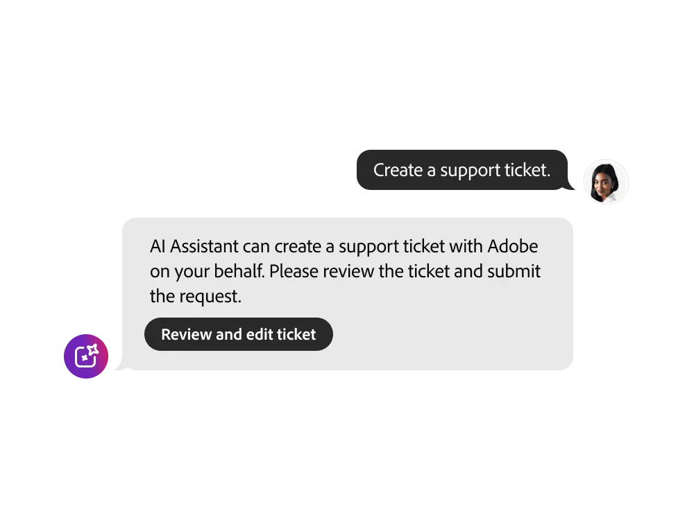 Adobe의 에이전틱 AI인 Product Support Agent로 제품 문제를 빠르고 쉽게 진단, 해결, 보고하세요. 인터랙티브한 지침을 제공해 셀프서비스를 지원하므로 문제를 더 빨리 해결하고 생산성을 높일 수 있습니다.